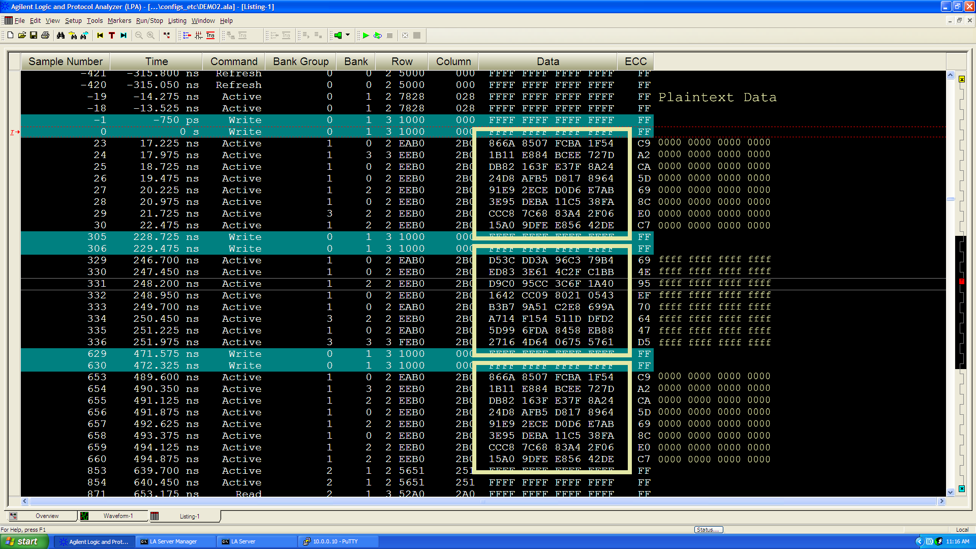 We use a logic analyzer to capture DRAM bus traffic, observing reads and writes to encrypted memory belonging to SGX. The top images show our actual setup and DDR4 interposer. On the bottom we show how our setup captures a memory read operation, which consists first of a row activation, then a read command, and finally the encrypted read data itself.