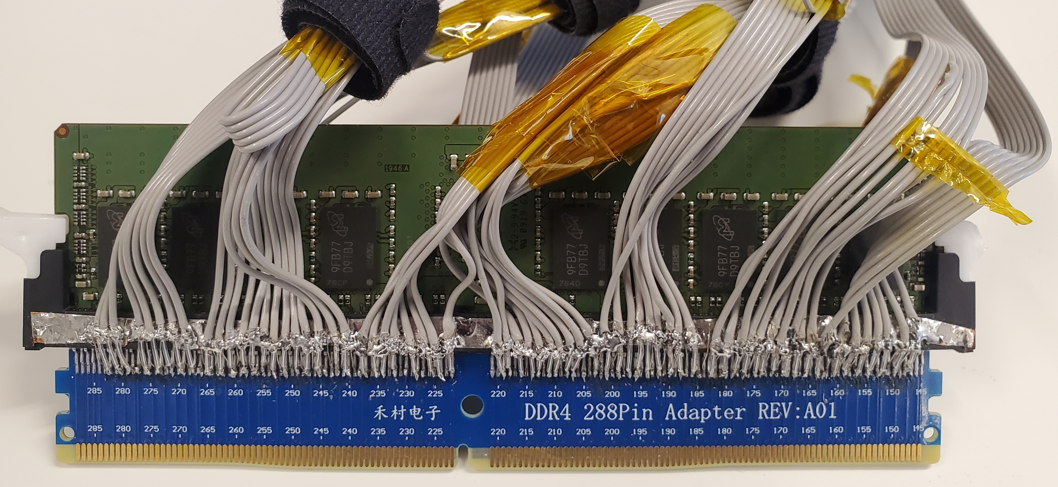 An interposer is a link that sits between two electrical interfaces; in our case, between the motherboard and DRAM. We then attach the interposer to a logic analyzer, which is a piece of equipment that allows us to see and record signals passing through the interposer, namely our computer's memory accesses and the data associated with them.
